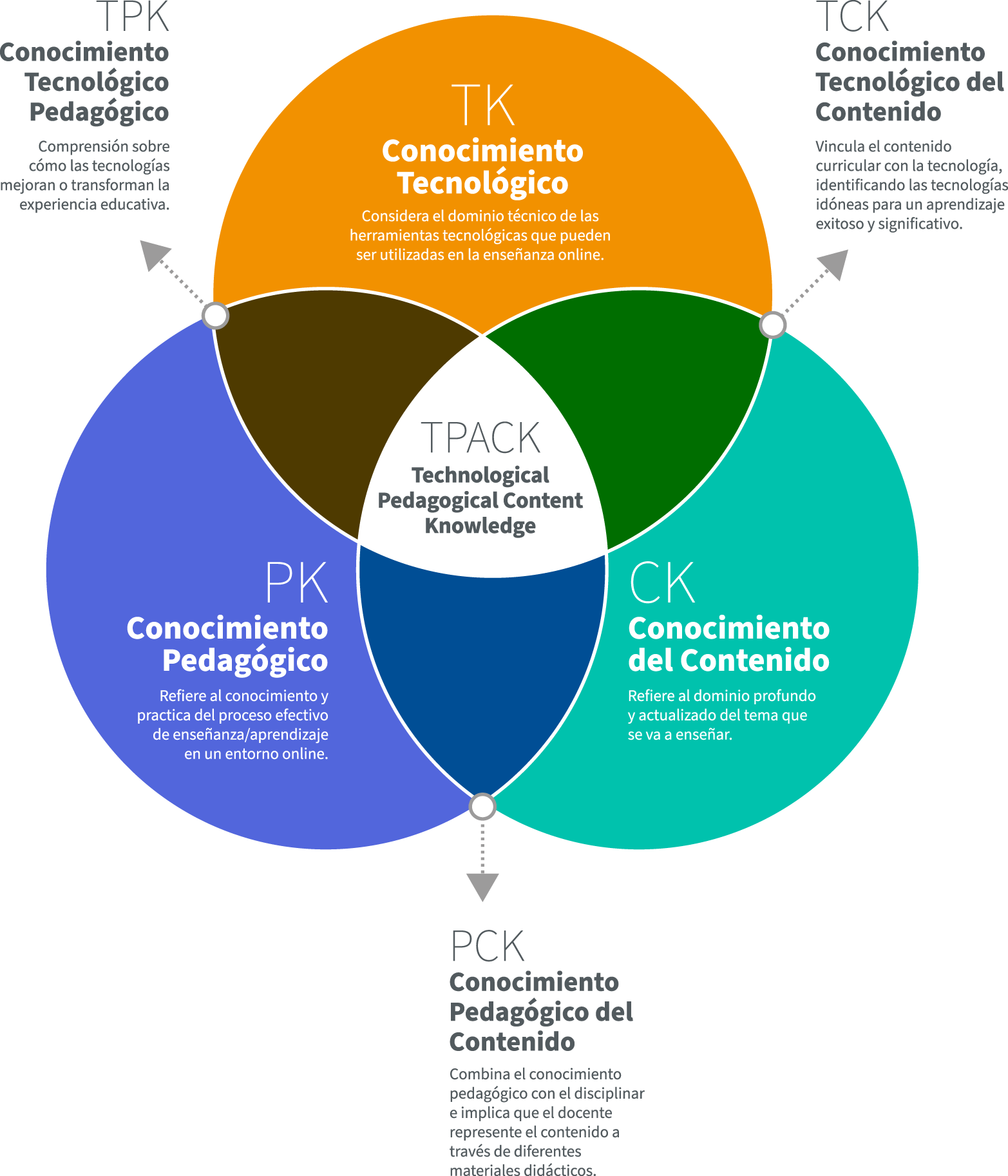 El conocimiento docente profundo se produce en la interacción de los tres conocimientos base:  Conocimiento del Contenido (CK), Conocimiento Pedagógico (PK) y el Conocimiento Tecnológico (TK), generando un punto de convergencia, en cual los educadores pueden diseñar experiencias de aprendizaje transformadoras y profundas arraigadas en la comprensión sólida del contenido, utilizando métodos pedagógicos mejorados por la tecnología adecuada y adaptada al contexto del curso.
